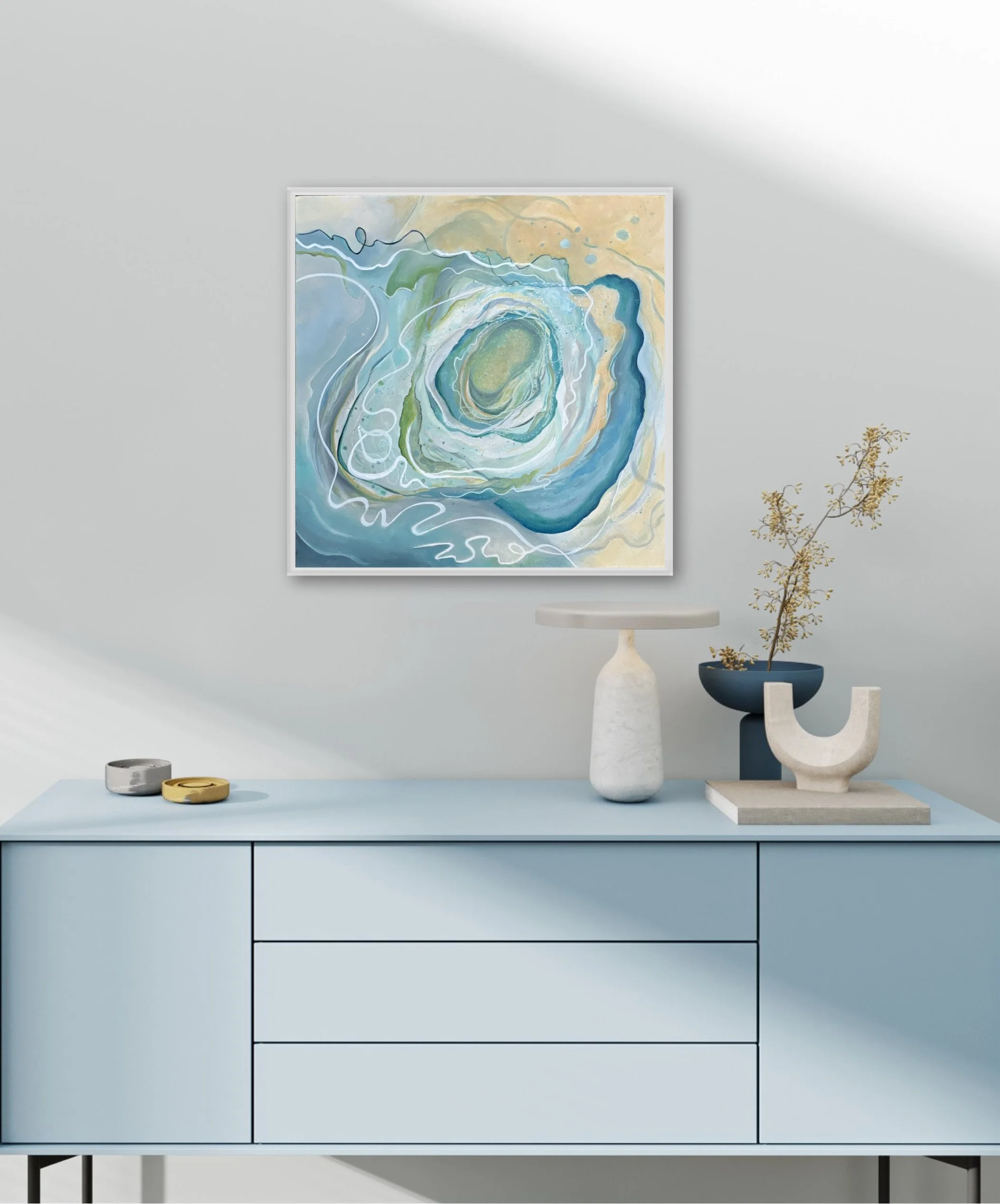 Original mixed media painting on cradled wood. 20” x 20” x 1” in a light grey wood float frame, Total size is 21 1/2”