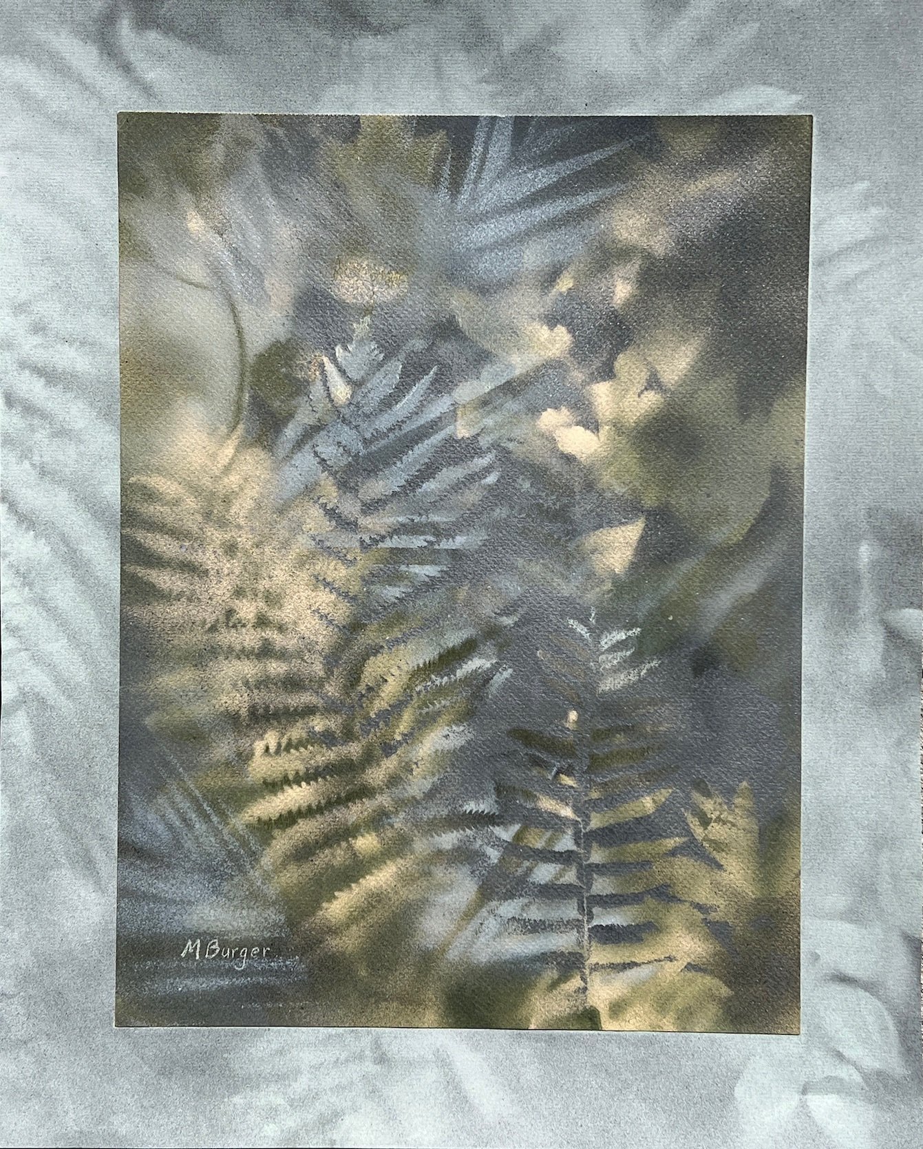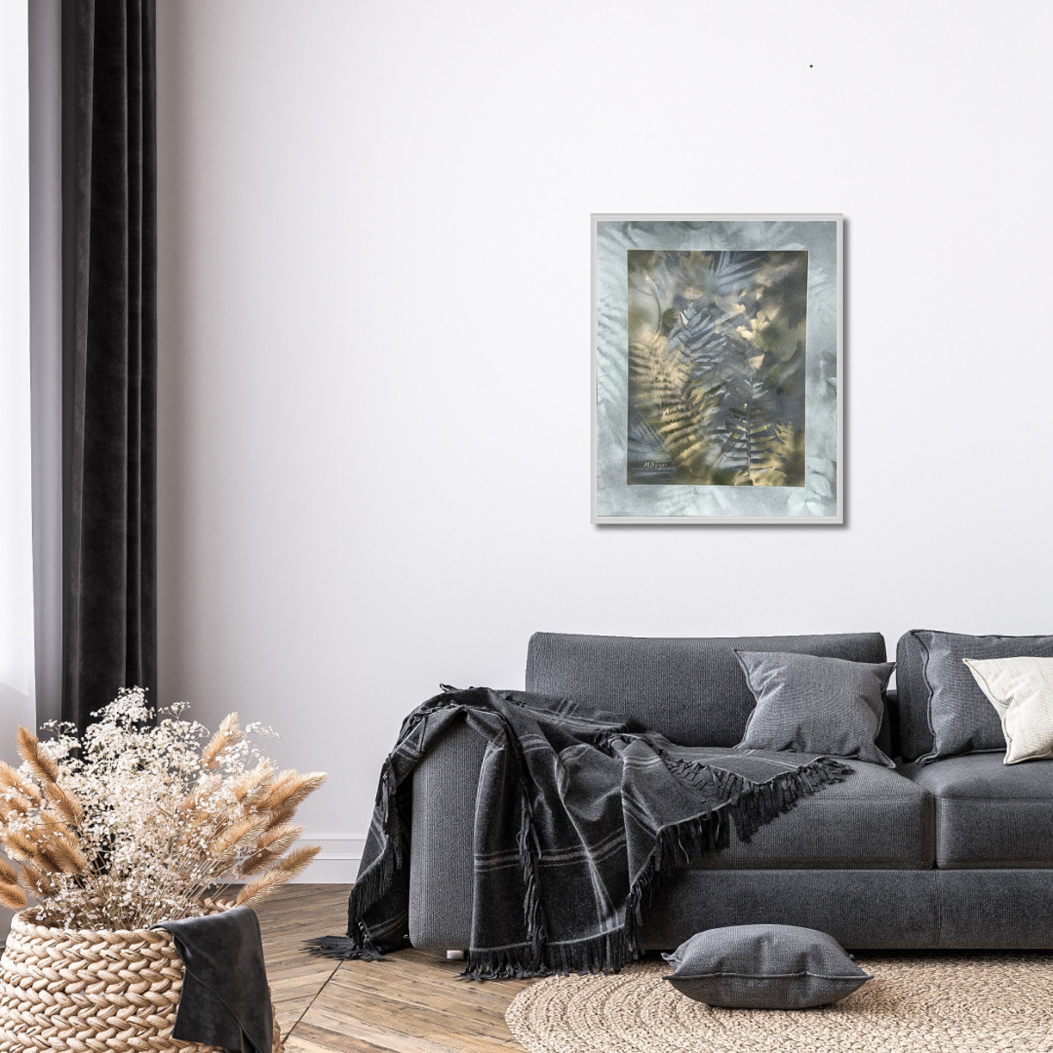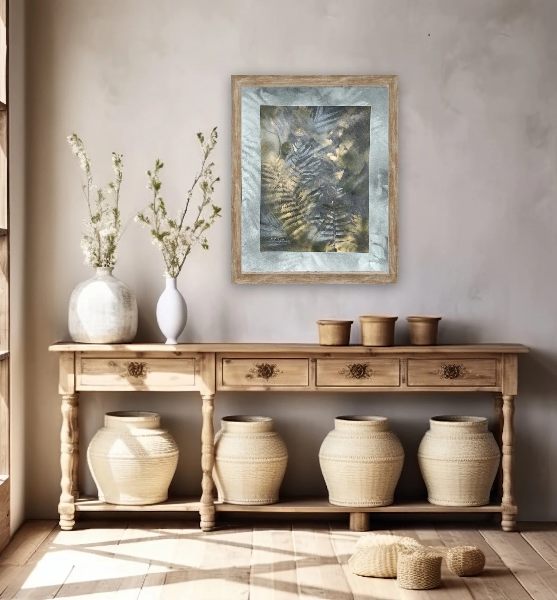 The colors of this unique work of art are grey, light blue, robin’s egg/soft blue-grey (pale blue-green), green and silver. Inspired by the natural beauty of plant forms, I used leaves and ferns. from my garden and woodland to create this one-of-a-kind mixed-media painting for your interior decor. Imagine walking in a sunlit forest or partially shaded garden with plants moving in the breeze. The border and main painting blend harmoniously. the soft edges melt into the background as the viewer’s cares and pressures of the world melt away and diffuse. Consider this delicate botanical art to create a serene environment in your space.