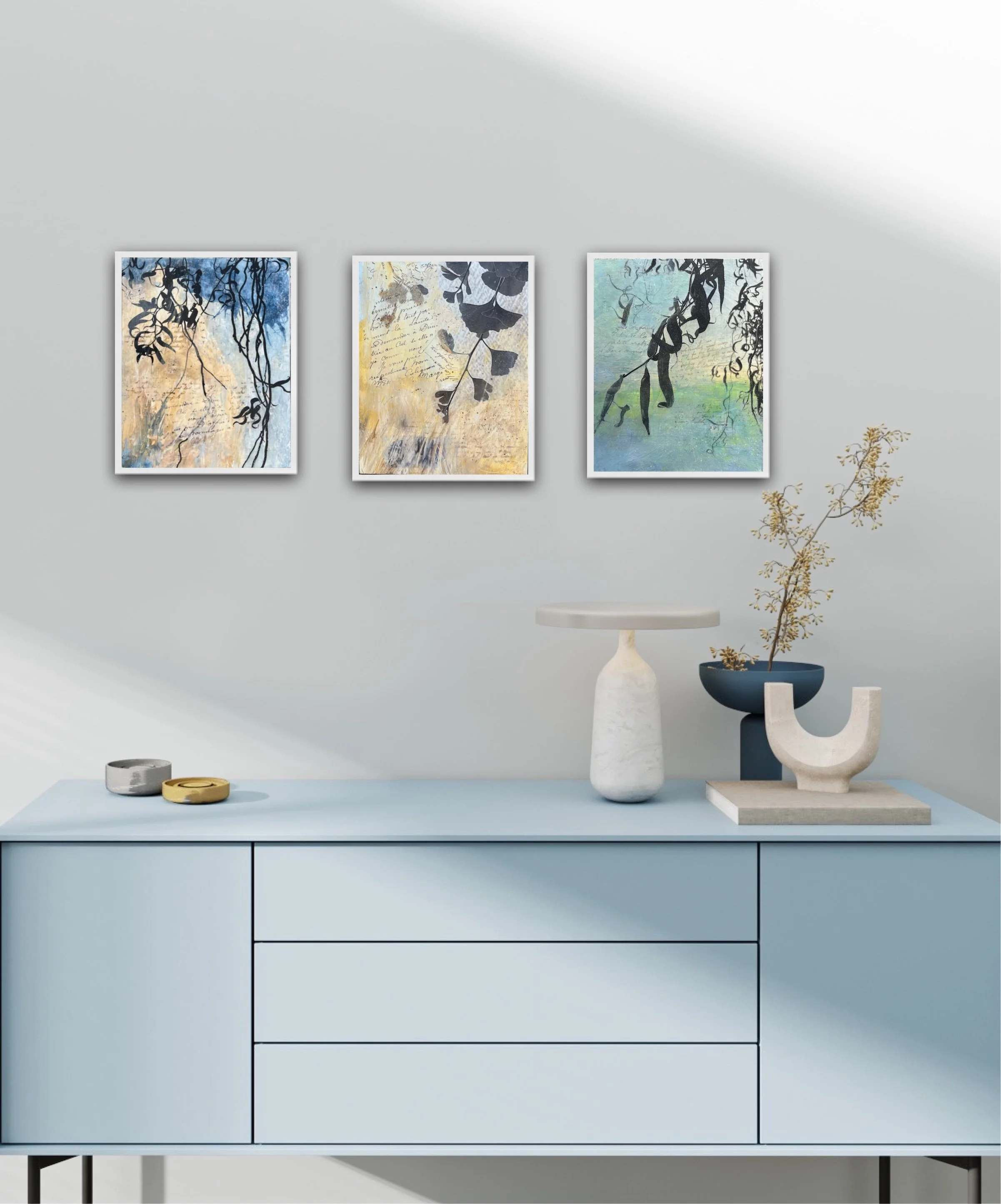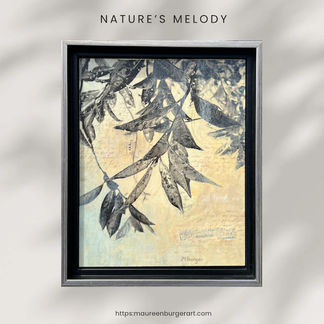 Mixed media. Natural materials—leaves, walnut ink, and acrylic paint on watercolor paper 9 × 12” adhered to 11 × 14” mat board. Unframed. This artwork can be oriented however you choose. Please read more about this series and Wabi Sabi style of art on my blog.