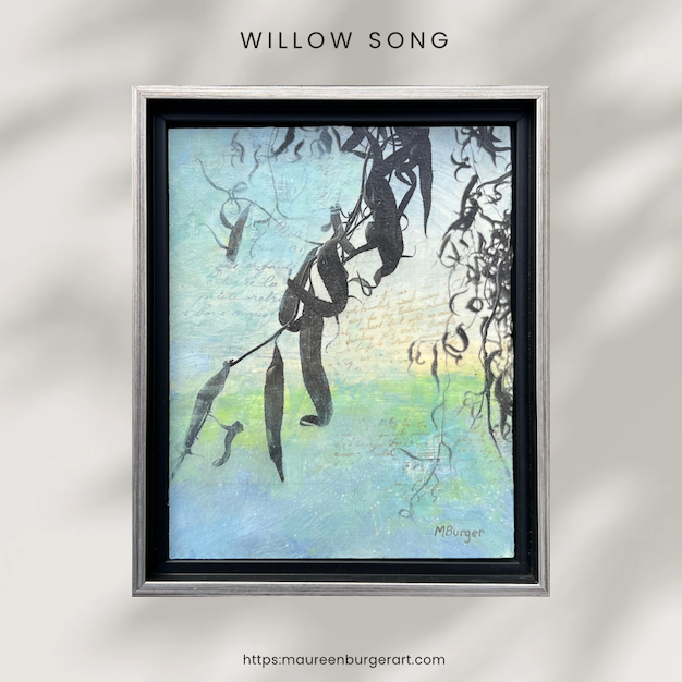 Original mixed media botanical painting on 8” x 10” wood panel. coordinate with your interior decor style. Framed in a black, antique brushed silver frame. Free shipping in the continental USA. This botanical work of art highlights the iconic ginkgo leaf, celebrated for its fan-like form and deep cultural symbolism. The delicate silhouette is layered over washes of soft earthy tones and fragments of vintage script, merging the permanence of nature with the fragility of memory. Known as a “living fossil,” the ginkgo becomes both subject and metaphor here, embodying resilience, grace, and time’s quiet unfolding.