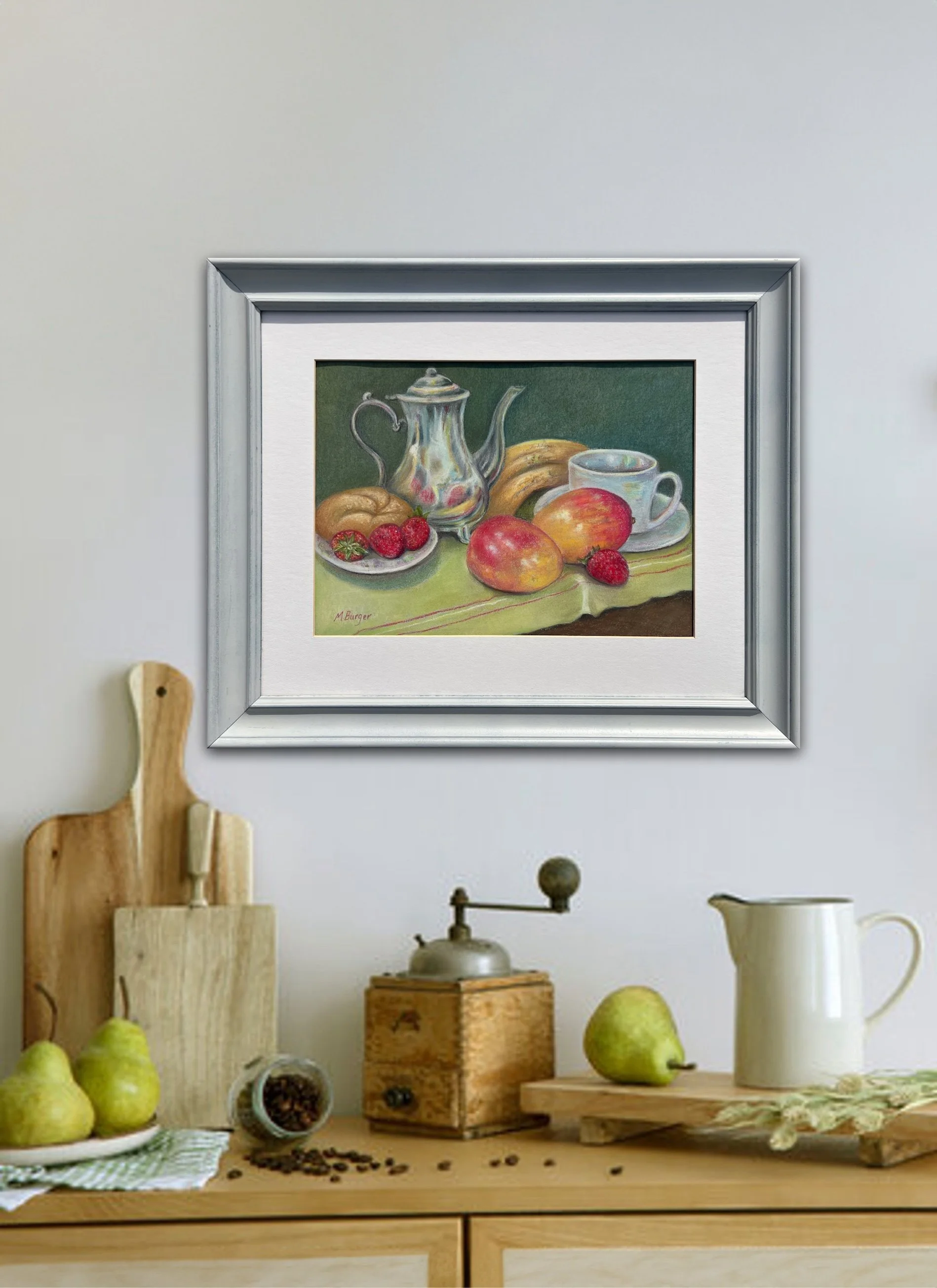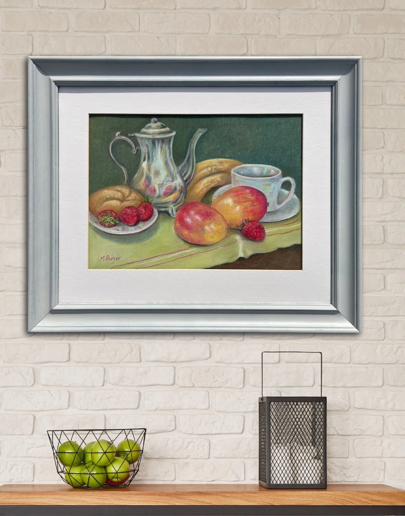 This cheery little chickadee will welcome you everyday and hopefully help to brighten your room and your outlook. Careful application of pastels and pastel pencils c0mbined with patience achieve this realistic feather texture and the texture of the branch. Brown, tan, black, and white bird with a softened, blended blue, grey-blue, with a bit of green and light yellow…colors of nature to coordinate with your color palette and bring nature into your home. It was challenging and fun to capture the image of this cute little bird and the textures with art materials. In the past few years I have enjoyed doing pastel paintings of birds. I have taken on the challenge of creating the feathers, details, and bark textures. These are representational; I may incorporate birds in semi-abstract art in the future.